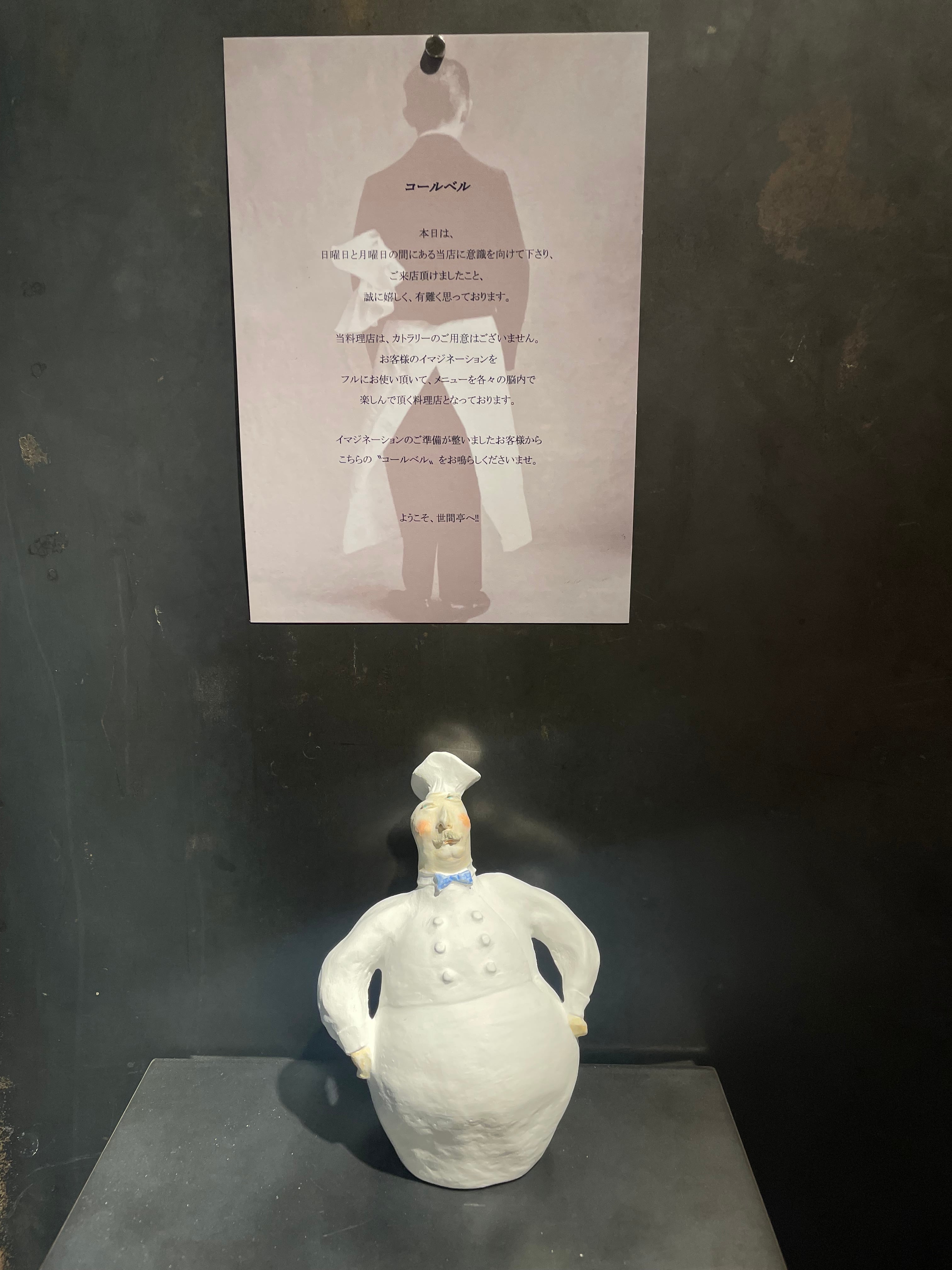 イマジネーションのご準備が整いましたお客様からこちらの“コールベル、をお鳴らしくださいませ。ようこそ、世間亭へ!!」